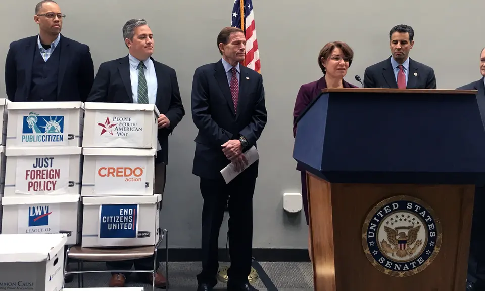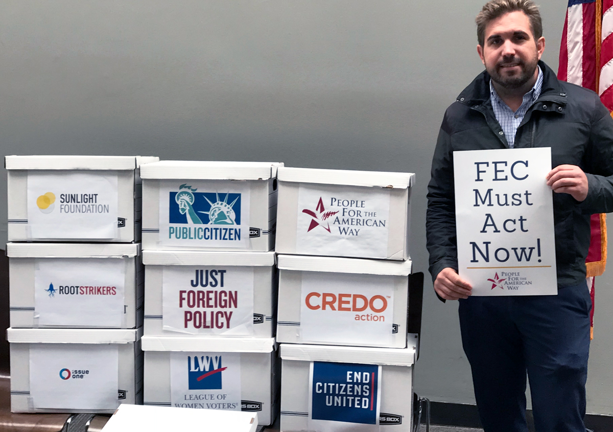 On November 9, People For the American Way joined several partner organizations in delivering more than 150,000 comments and signatures—a new record—calling on the Federal Election Commission (FEC) to establish new guidelines for disclosure in online political spending. Senator Amy Klobuchar, Senator Chris Coons, and other members of Congress attended the event on Capitol Hill publicizing this historic delivery.