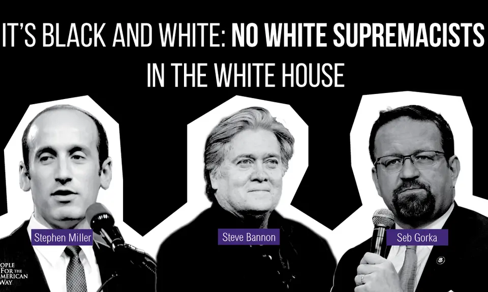 With the escalation in hate crimes since Trump's election — from sometimes fatal violence towards religious and racial minorities to appalling displays of white nationalism and out-of-control Nazi rallies — it is clear that Steve Bannon, Seb Gorka, and Stephen Miller do not belong in the White House. It's time for Trump to take real action and fire these men, who bring explicit white nationalist ideologies into the Oval Office. Sign the petition now.