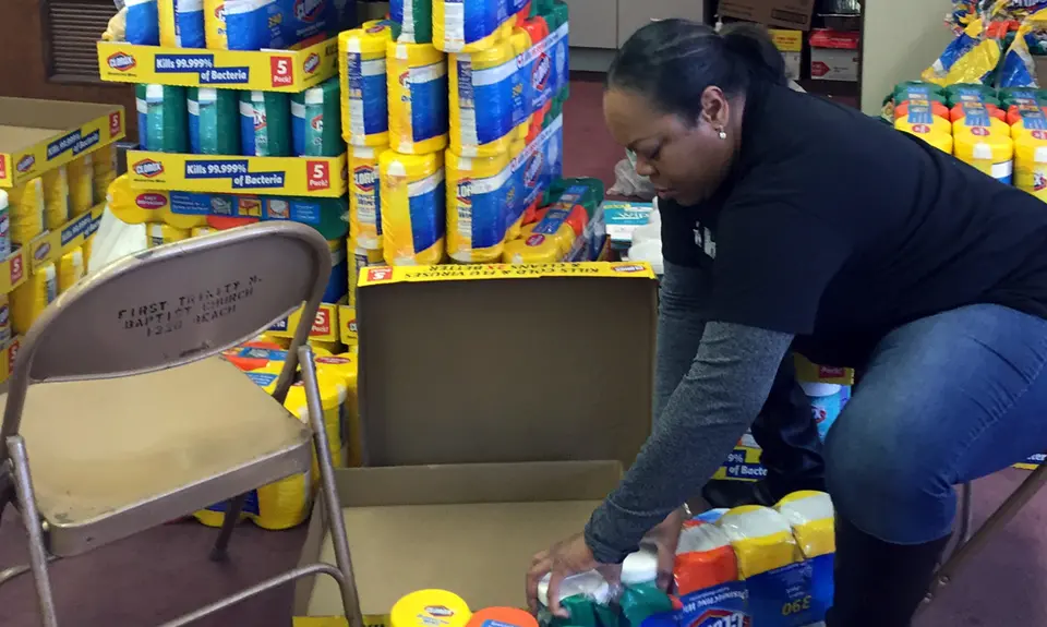 The volunteers filled school buses, U-Haul trucks and cars with more than 1,000 rattling bags, lots of laughter, and goodwill. In 20 degree weather—and with the wind chill factor making it negative two degrees—the group delivered more than 800 bags filled with purchased and donated household cleaning products, baby and adult wipes, and hand sanitizers to younger residents who had children in three public housing locations. About 250 bags were also donated to the First Trinity Baptist Church, where Micah Leadership Council member Reverend Ezra Tillman is a pastor, for people who come through to pick up cases of bottled water. The deliveries also included information about voting in Flint created by VESSELS.
