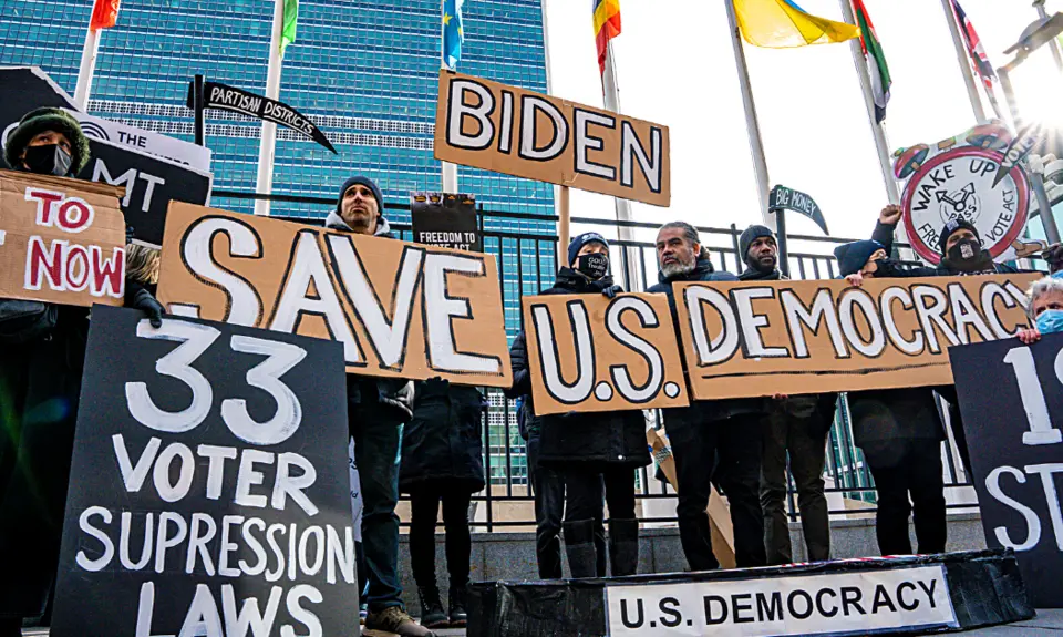 Yet for activists in New York City, organized by the Worker’s Circle, Black Voters Matter, and Fair Elections For NYC, with organizational and on the ground support from People For the American Way, Biden’s hosting of an international democracy summit while multiple voting rights bills languish in the Senate is a point of contention. Under the banner of “Democracy, Hypocrisy,” dozens of activists from New York City gathered near the UN to protest Congress and Biden’s inaction on voting rights bills, namely the Freedom to Vote Act, the John Lewis Voting Rights Advancement Act, and the DC Statehood Act. NYC’s action was among nine actions across the country that took place Thursday to push key senators and the president towards their passage before the end of the year.