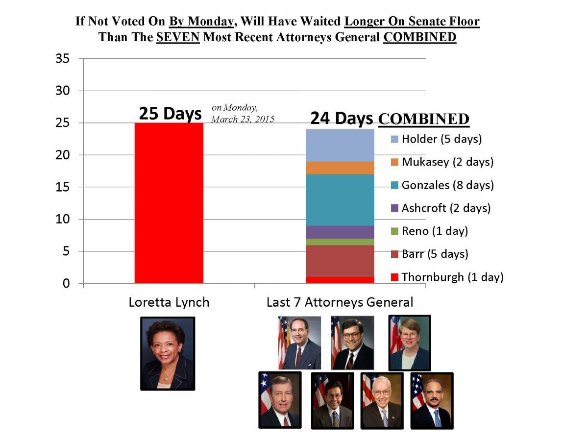 Until now, regardless of which party was in the White House or in control of the Senate, the attorney general nominee has gotten a confirmation vote very quickly upon committee approval. But Lynch’s nomination has been languishing on the Senate floor for nearly three weeks, longer than the wait-time for the past five attorney general nominees combined.