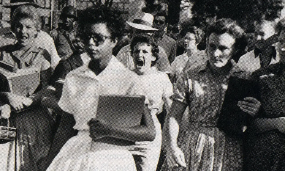 After the 1954 Brown v. Board of Education decision, US schools were ordered to desegregate “with all deliberate speed.” The Little Rock, Arkansas, school board initially planned to integrate its first schools during the 1957-58 school year, but when a group of Black students arrived, known now as the Little Rock Nine, they were met with aggression and violence from white protestors. The resistance was so intense that the National Guard had to be called in to escort the students.