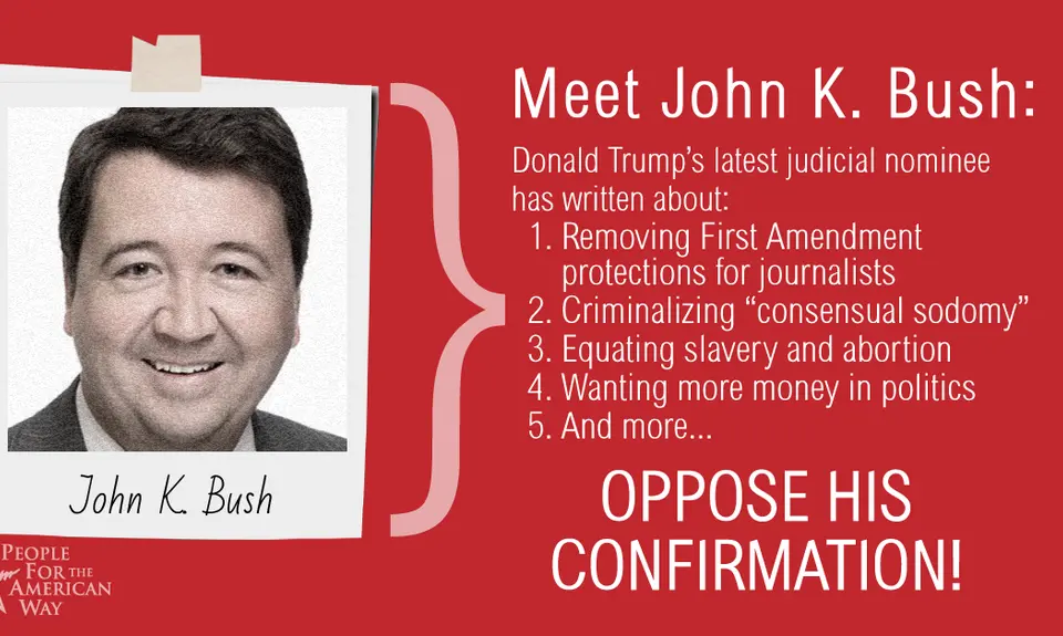 On behalf of the hundreds of thousands of members of People For the American Way, I write to express our strong opposition to the confirmation of John K. Bush to a seat on the U.S. Court of Appeals for the Sixth Circuit.