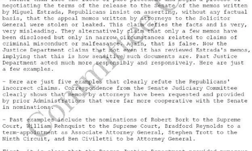 On March 18, 2003, Miranda relayed the points Chairman Leahy was planning to make about the nomination of Miguel Estrada to the D.C. Circuit, which Democrats very much opposed. But Miranda didn’t write up a summary of the points. Instead, in an email with the subject line “For Use and Not For Distribution,” he sent a draft of the statement Leahy and his staff were preparing: