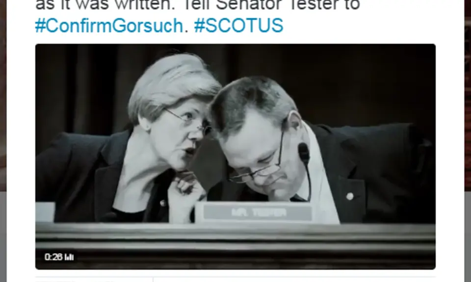 On Twitter, the group is using paid advertising to pressure Senator Jon Tester to support Gorsuch. Gorsuch has a troubling record of supporting corporations over workers and defending the increased flow of money in politics as a form of free speech. Because of his record on these and other issues, Gorsuch is a disastrous choice for the Supreme Court.
