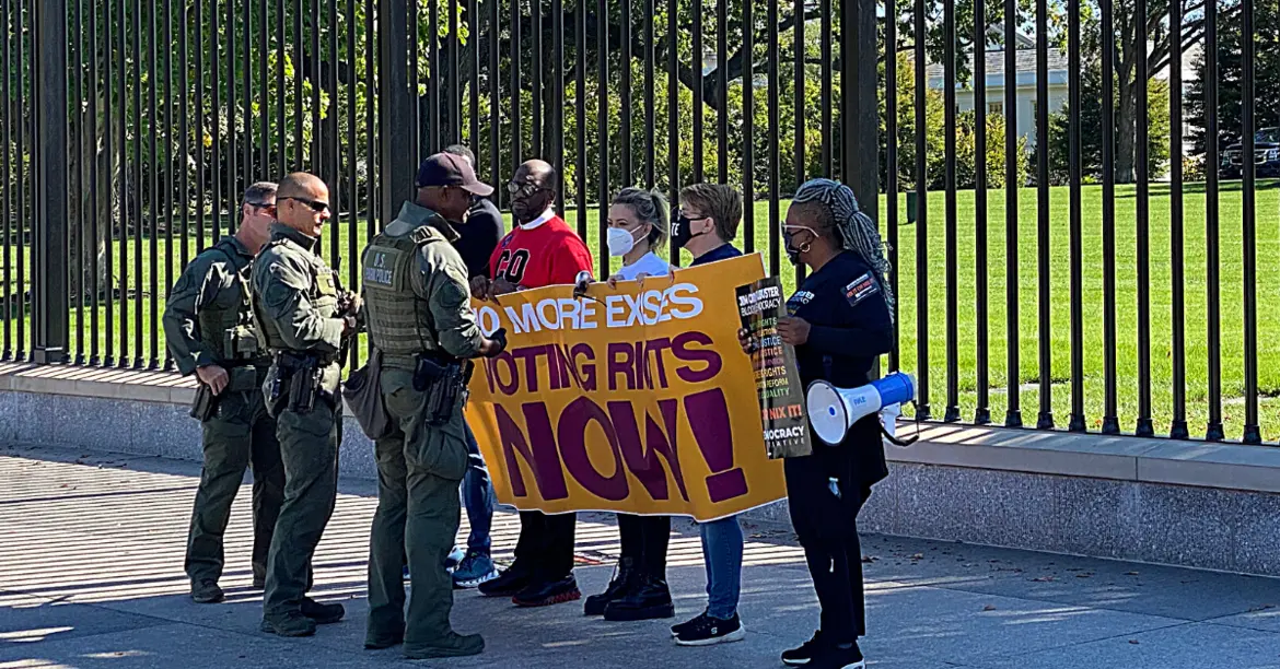 Now: Protesters, including @BenJealous, @Alyssa_Milano, faith leaders, and civil rights leaders, are being arrested outside the White House for calling on President Biden to lead on voting rights.