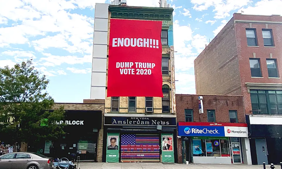 “Today, we are three weeks away from the most important election of our lifetime and for an historic Black newspaper to blanket their building in Enough of Trump art, in the middle of Harlem, sends a clear message to the nation and the world that people have had enough of Trump,” said Ben Jealous, PFAW president.