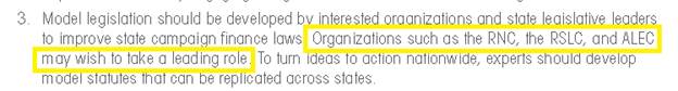 The RNC places ALEC alongside the Republican State Leadership Committee (RSLC) and the RNC as an organization that is well-suited to “improve” campaign finance laws and propagate them nationwide:
