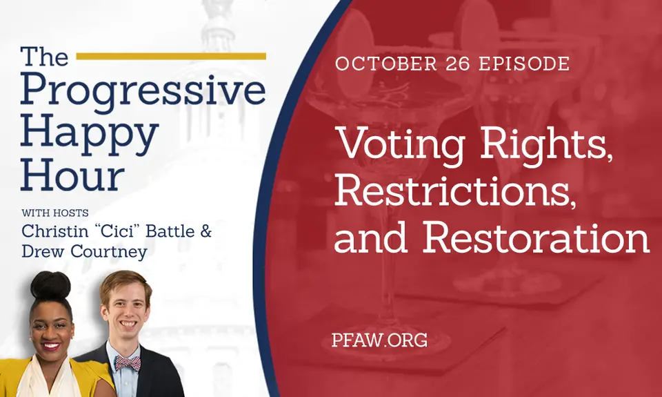 In the October 26 episode of “The Progressive Happy Hour,” cohosts Cici Battle and Drew Courtney talk to Jen Herrick, senior policy analyst at PFAW, about voter suppression and restrictions, and how a voting restoration ballot initiative on the ballot in Florida could change the state’s politics.