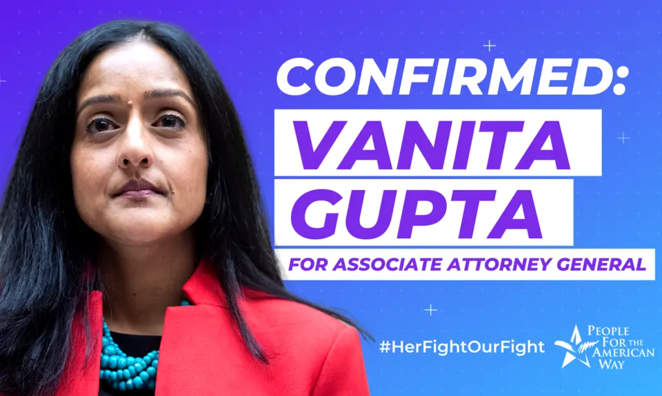 Washington, DC— Following today’s Senate confirmation of Vanita Gupta as the new Associate Attorney General of the United States, People For the American Way President Ben Jealous released the following statement: