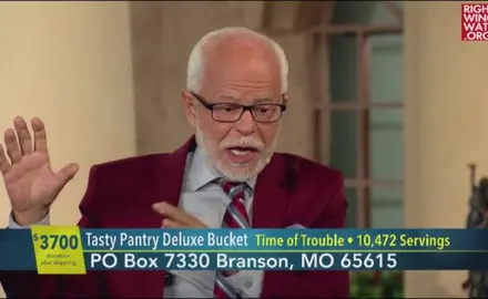 End Times prepper pastor Jim Bakker took advantage of escalating tensions with North Korea to pitch his brand of survival food buckets on his program today and warn that "the spirit of the Antichrist" is on the loose in America, as demonstrated by the fact that people are mocking God's prophets and