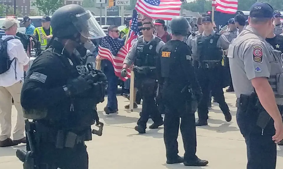 A robust but police-compliant crowd of protesters stood behind law enforcement’s lines of separation, booing and shouting as the extremists made their way into the station with a law-enforcement escort.