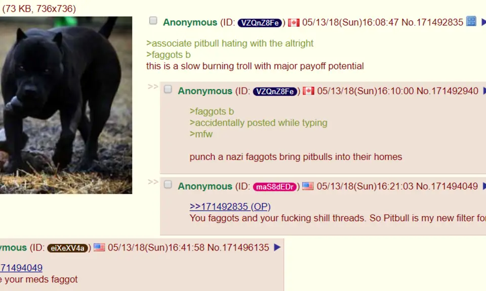 While some naïve Twitter users are debating pit bulls purely on the merits of the dog breed, many right-wing figures have attempted to co-opt the discussion to reconcile their use of crime statistics to justify racism. Although alt-right figures have been pushing the trope for months with little viable success, multiple new threads on the anonymous image board 4chan using racial slurs to liken black people to dogs have invigorated the racism-laden discussions about demographics in America. One user called the pit bull debate “slow burning troll with major payoff potential”: