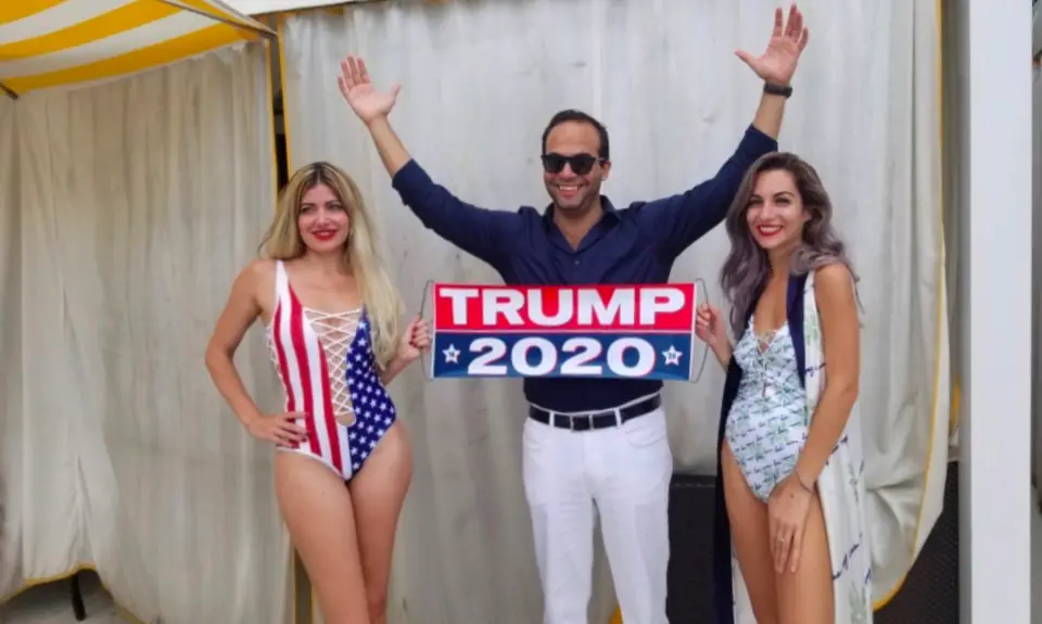 The sky unleashed a Florida downpour, and pool-goers huddled under umbrellas striking up conversations in close corridors. When the sky cleared, Simona Papadopoulos, wife of former Trump campaign aide George Papadopoulos—who went to federal prison for making false statements to FBI agents about the timing of his contact with Russian intermediaries in 2016—held a swimsuit fashion show. Simona and two other models strutted out on a poolside black carpet in a series of colorful, skimpy bikinis and one-pieces; the show ended with Simona donning an American flag one-piece in—her homage to the nation.