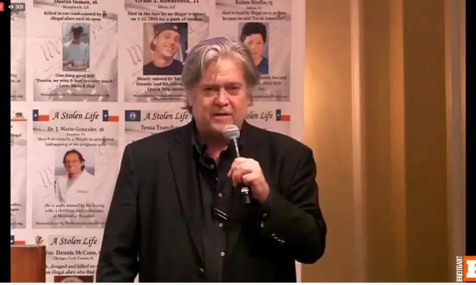 Bannon speaks in front of the "Stolen Lives Quilt." Screenshot of live stream via Breitbart News.