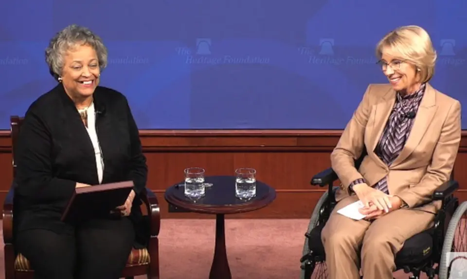 U.S. Secretary of Education Betsy DeVos celebrated National School Choice Week on Wednesday with an appearance at the right-wing Heritage Foundation for an event promoting “school choice” generally, and marking the 15th anniversary of the federally run voucher program in the District of Columbia. “School choice” is an umbrella term encompassing an array of different programs, all of them funded by taxpayers, and many of them financed at the expense of regular public schools. DeVos, who was in a wheelchair because she is recovering from a December 30 bike accident, was interviewed by Heritage Foundation President Kay Coles James, who called DeVos “an American treasure and a national hero.”