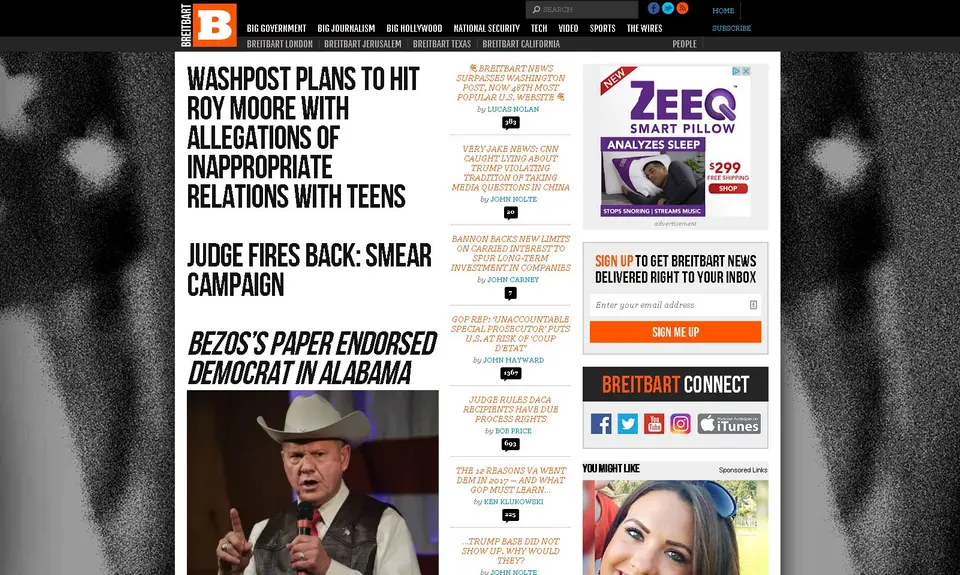 Shortly before the Washington Post story broke, Breitbart’s front page blared headlines attempting to discredit the upcoming allegations: “WashPost Plans to Hit Roy Moore with Allegations of Inappropriate Relations with Teens,” “Judge Fires Back: Smear Campaign,” “Bezos’s Paper Endorsed Democrat in Alabama.”