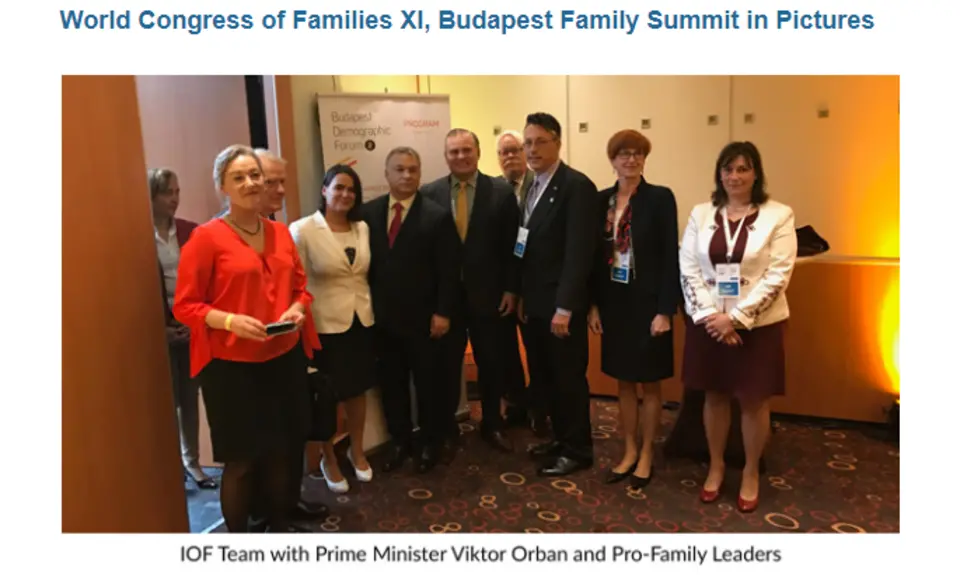 International Organization of the Family/World Congress of Families leaders pose with Hungarian prime minister Viktor Orbán at the 2017 Budapest Family Summit (Screenshot from June 16 IOF email)