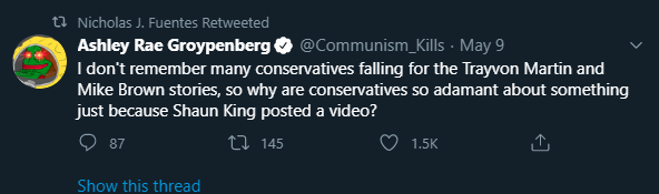 Ashley Rae Goldenberg, an investigative reporter at CRC, has gained newfound attention from the far-right by taking part in an effort to smear Arbery and downplay his death after the Georgia Bureau of Investigation arrested father and son Gregory and Travis McMichael on charges of murder and aggravated assault last week. Goldenberg has advanced the idea that Arbery’s killers were justified in shooting him dead in the street, even going so far as to suggest that the government’s arrest of the two men was part of “race war” she claims has been playing out in the United States “for decades.” How Goldenberg has reacted to Arbery’s death fits a pattern: far-right actors have long attempted to demonize black victims of violent crimes that have received national outrage.