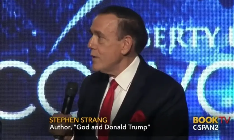 The release quotes from Strang’s book, which was published last fall: “Our founders never hesitated to affirm their belief that God brought us to this continent for a reason, and I believe that’s why this president made the spiritual interests of the American people such a major focus of his campaign.”