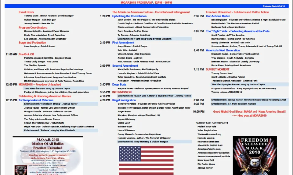 Now, it appears that both Foxx and Stewart have been dropped from the speaker's list. Stewart and Foxx no longer appear on the site’s speaker line-up and the event schedule sent to the Mother of All Rallies email list Wednesday doesn't include times for their originally planned presentations. Earlier copies of the schedule had Stewart scheduled to speak in a slot about illegal immigration, as seen below: