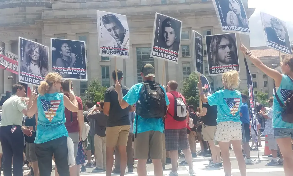The small eclectic collection of attendees included a group of demonstrators making claims that various famous celebrities and political figures had been secretly murdered, QAnon supporters, and Infowars fans, who stood on the swath of heat-radiating pavement that is Freedom Plaza while speakers bemoaned their lost status as influencers. One speaker, Greg Aselbekian, spent minutes screaming about being banned from the dating app Tinder.