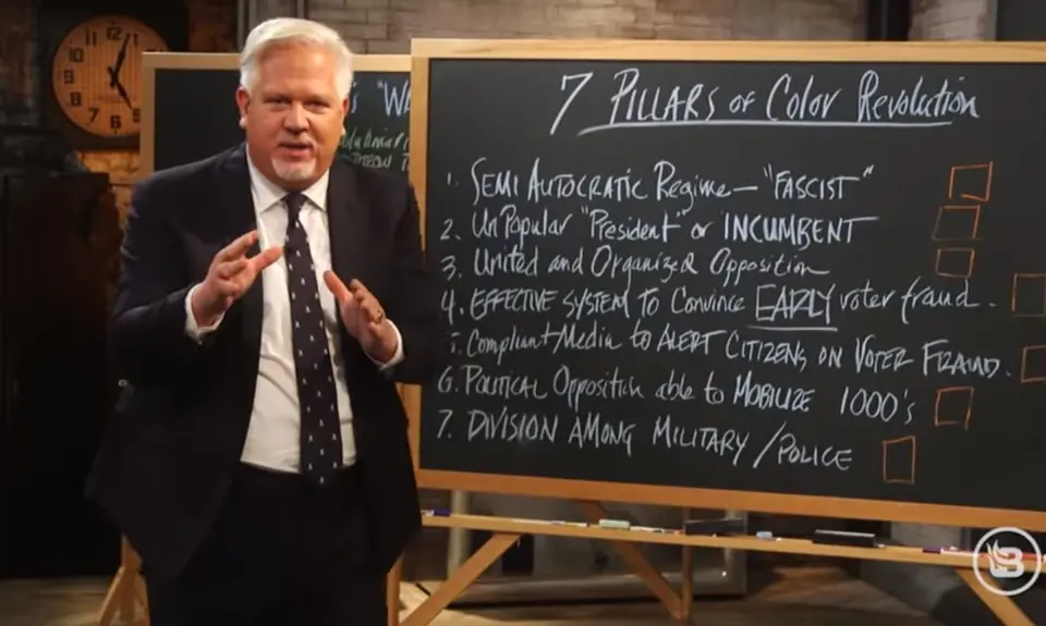 Beck took to his chalkboard to spell out what he said was evidence of a “U.S. color revolution” in the making. Beck alleged that Democrats have dominated or found allies in national media, entertainment, education, the “deep state,” the military, finance, social media, and other bastions of society. Beck also claimed that COVID-19 lockdowns have primed Americans to be “compliant” during a takeover of the government.