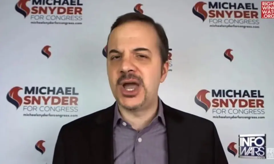 "They're attacking me just like they're attacking Donald Trump," Snyder continued. "They're trying to label me as a conspiracy theorist ... There is going to be a huge effort in this campaign to tie me to you guys, to tie me to David Knight, to Alex Jones, to InfoWars. The establishment here, they're scared to death that someone like me, with close ties to you guys, could end up being a member of Congress from our state. They're freaking out and so they want to make a huge deal of it, but you know what I'm going to tell them when they bring that up and try to attack me on that? I'm going to say I'm proud to stand with David Knight, I'm proud to stand with Alex Jones and InfoWars, these guys are fighting for America, I'm fighting for America and so I'm just going to be proud of it."