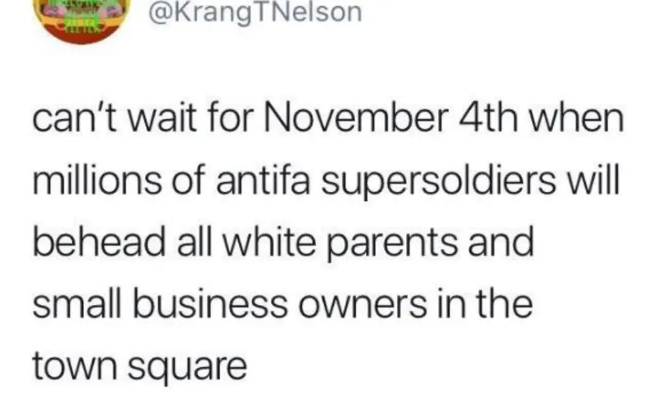 Three prominent right-wing writers cited a satirical Twitter post to warn that Antifa protesters are planning to launch a civil war on November 4 that included beheading “white parents and small business owners.”