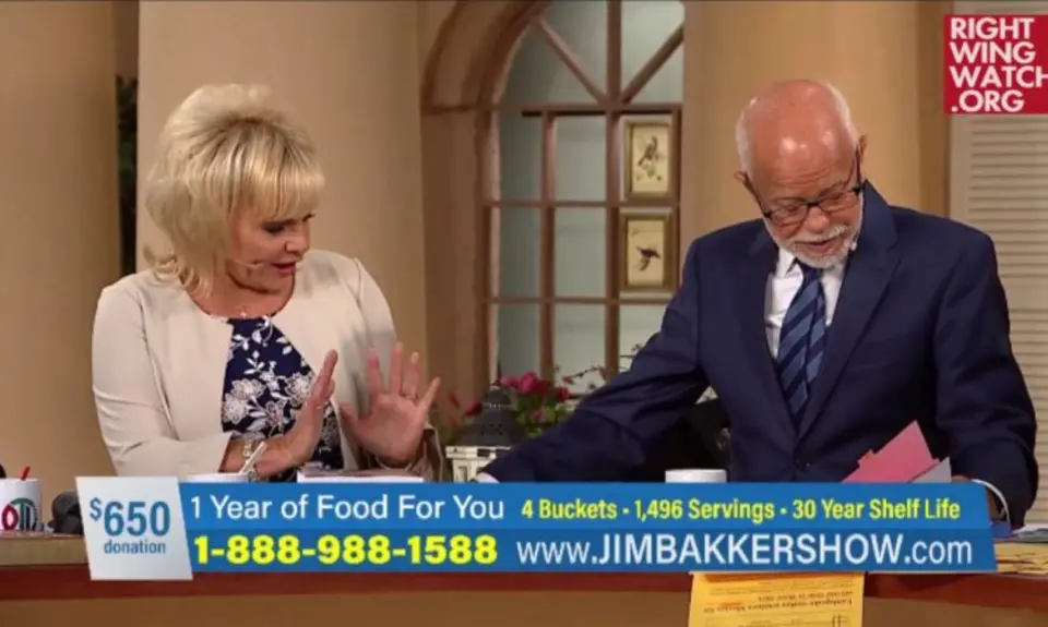 After offering his audience a soon-to-expire deal on food buckets, Bakker explained that his ministry takes “a piece” of the payment. “A little part of it goes to keep us on the air,” he said, “and it’s really a small part, it’s not even what a big store would have, a lot of stores would have a lot more profit in it than we do, but it’s what we do. It’s keeping us alive, but it’s going to keep you alive.”