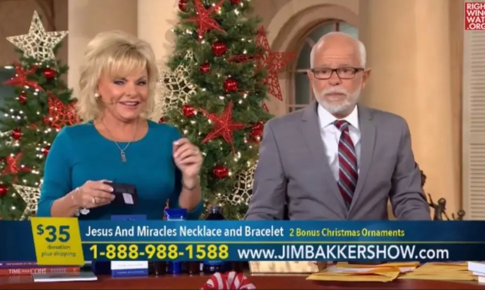 While hawking gaudy Christmas merchandise on his television program today, End Times prepper pastor Jim Bakker claimed that saying "Merry Christmas" had been outlawed a few years ago.