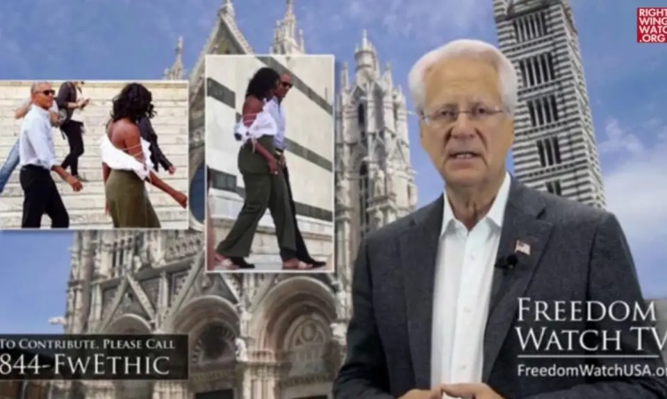 "The thing that is really troubling about this," Klayman said, "[is that] he and Michelle went into a church in Siena, Italy, and she basically had an open shoulder ... showing a lack of respect to the Catholic Church and Christianity. Of course, that's not surprising because her husband is, in fact, a closet Muslim, someone who worships the Quran over the Bible, who has fooled the American people all these years into thinking he's a Christian ... who wears a ring that says, 'My only God is Allah.'"