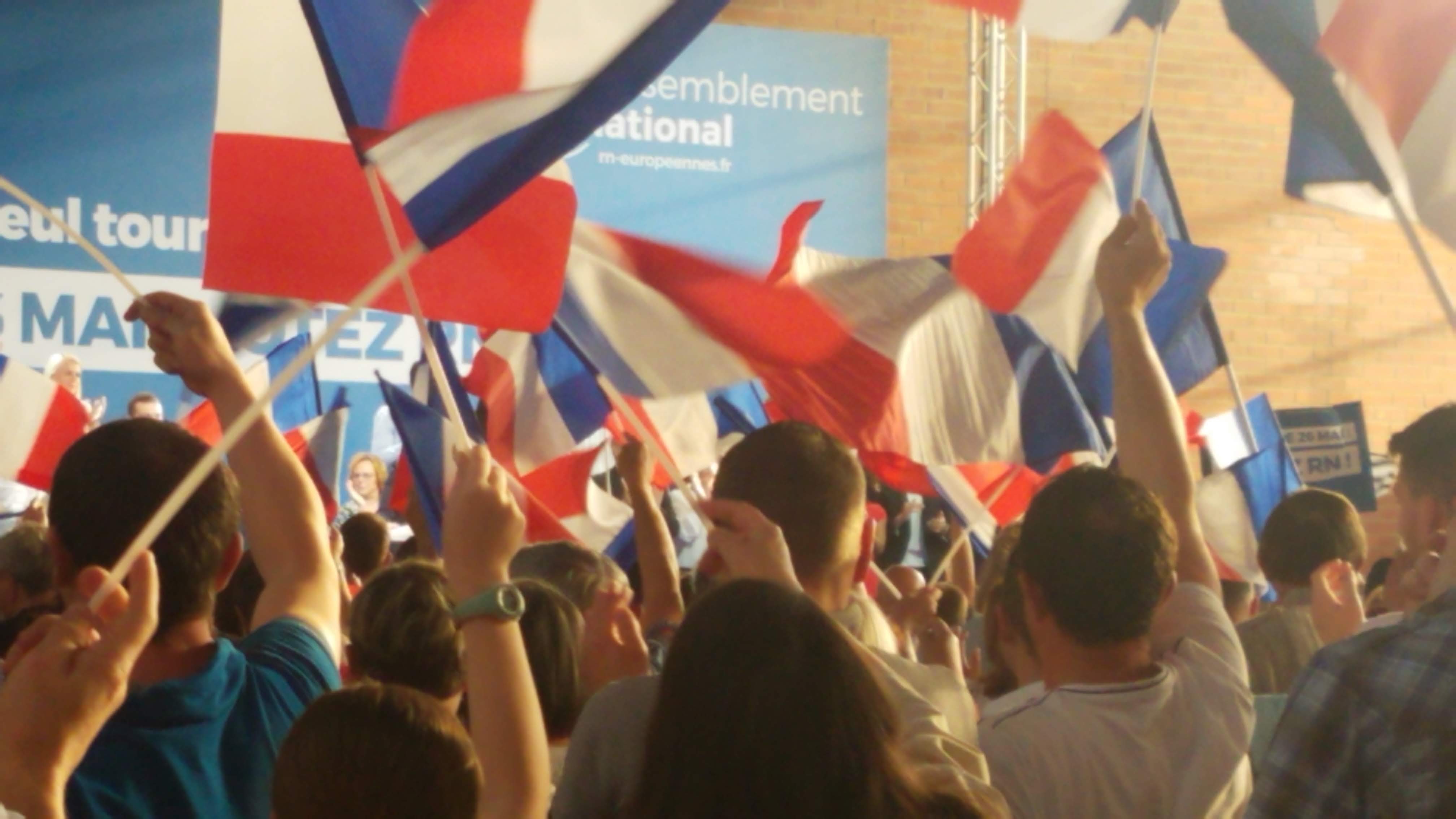 Supporters of France's far-right Rassemblement National party wave flags at a party rally on May 24, 2019, during the campaign for European Union parliamentary seats. (Photo by A.M. Stan for Right Wing Watch)