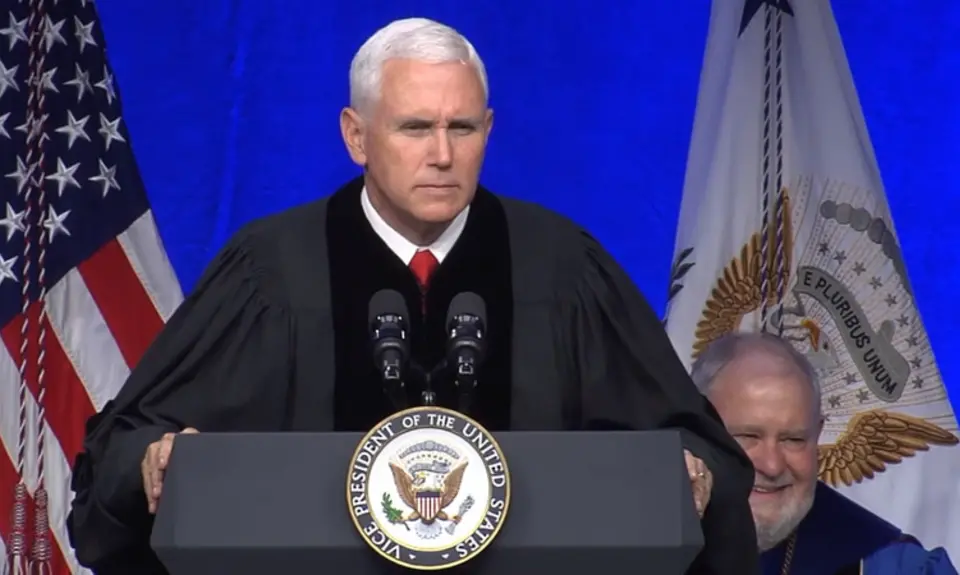 Vice President Mike Pence delivered the commencement address on Saturday at Hillsdale College, a conservative Christian university that famously refuses any government assistance, including individual student financial aid, to maintain its independence from government regulation. Pence and his wife Karen were both presented with honorary degrees by Hillsdale President Larry Arnn.