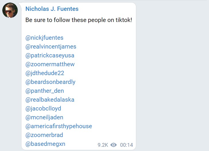 However, several accounts listed by Fuentes on Telegram as being affiliated with the “America First” white nationalist movement remain active on TikTok at the time of publication, including: