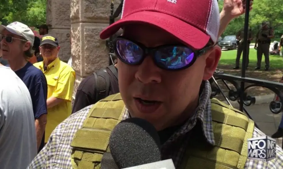 Rob Dew of the Austin-based InfoWars was ">on the scene of the local march, where he interviewed Oath Keepers board member and Texas chapter president Jay Stang about what Stang insisted were “paid” counter-protesters representing a “totalitarian” nexus of communism and Islam.