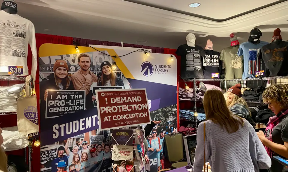 As the panel closed, attendees, which included hundreds of high school students, funneled out of the ballroom to the March for Life Expo. At the entrance was a booth for Alliance Defending Freedom, a multimillion-dollar anti-choice, anti-LGBTQ litigation shop, handing out free swag to excited students. ADF was central to the overturning of Roe and represented Mississippi in the Supreme Court case; its lawyers have previously bragged that they helped write the Mississippi law as part of their strategy to ban all abortions in the country.