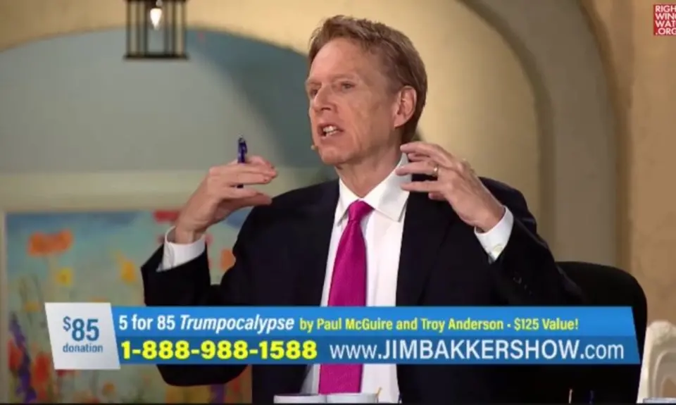 End Times author Paul McGuire appeared on Jim Bakker’s television program again today to promote the book he recently co-wrote, "Trumpocalypse: The End-Times President, a Battle Against the Globalist Elite, and the Countdown to Armageddon."