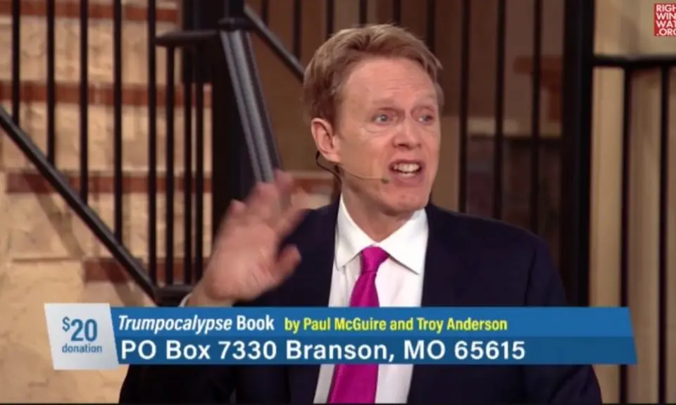End Times authors Paul McGuire and Troy Anderson appeared on Jim Bakker's television program today to promote their book, “Trumpocalypse: The End-Times President, a Battle Against the Globalist Elite, and the Countdown to Armageddon." During the discussion, McGuire said that he and Anderson wrote the book, in part, to explain to Christians who refuse to support Trump that God often uses "imperfect leaders" to carry out His agenda and that Trump is nothing compared to some of the pagan leaders in the Old Testament.