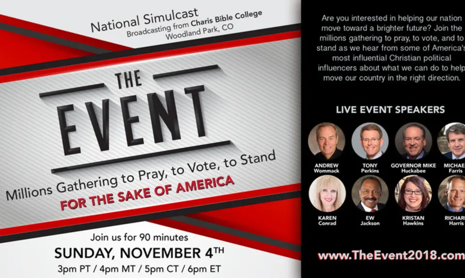The Event is being sponsored by the Family Research Council, conservative evangelical voter turnout operation United in Purpose, and Andrew Wommack Ministries and its Truth and Liberty Coalition. It will be held at Charis Bible College—“an extension of Andrew Wommack Ministries”—near Colorado Springs, and will be simulcast to churches and other host locations around the country.