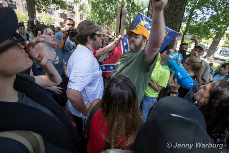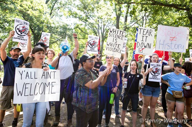August 25, 2018 -- The neo-Confederates and other white supremacists were met by a group of anti-racism, anti-fascism protesters. Activist Maya Little stands near the center, wearing a camouflage tee shirt. (Photo: © Jenny Warburg)