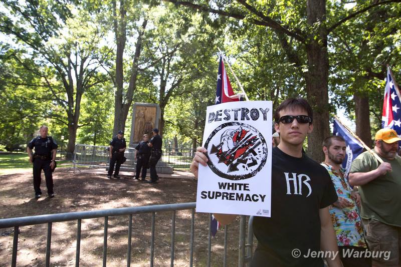 August 25, 2018 -- An anti-racism protester stands near neo-Confederate demonstrators in front of the empty pedestal where a statue depicting a Confederate soldier stood until activists toppled it on August 20. (Photo: © Jenny Warburg)