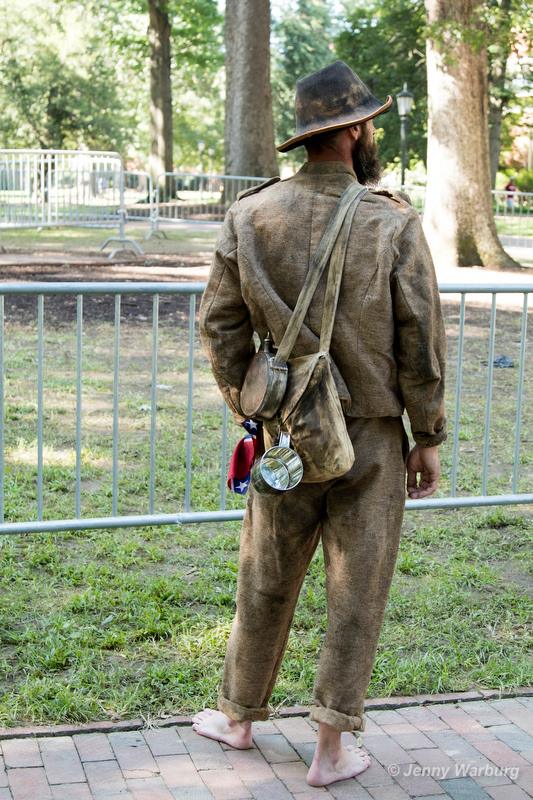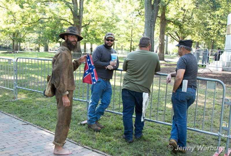 August 25, 2018 -- Representing the Confederate cause was Casey Bricknell--pictured here and below--who arrived dressed in the costume of a Civil War secessionist soldier, in the style of Silent Sam, the nickname for the statue that was toppled by demonstrators on August 20, 2018. (Photo: © Jenny Warburg)
