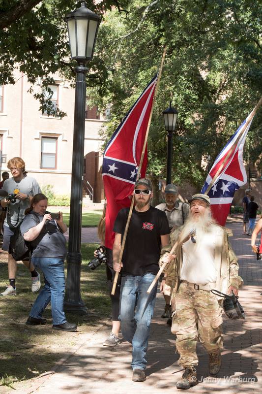 August 25, 2018 -- Neo-Confederate demonstrators Joshua Pennington (left) and Frank Harper (right) arrive on the campus of University of North Carolina-Chapel Hill to protest the removal of a statue dedicated to Confederate soldiers. The statue, nicknamed "Silent Sam," was toppled by anti-racism activists on Monday, August 20. (Photo: © Jenny Warburg)