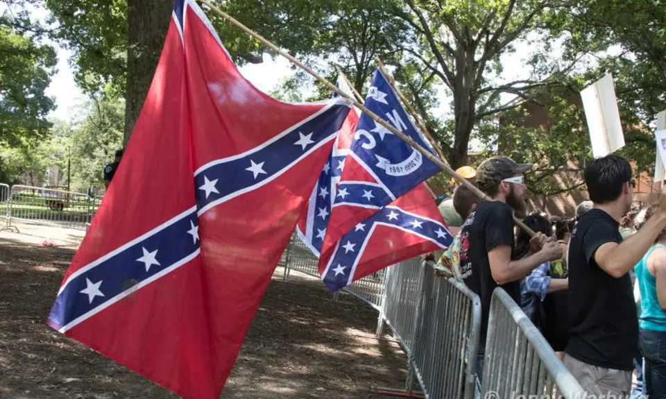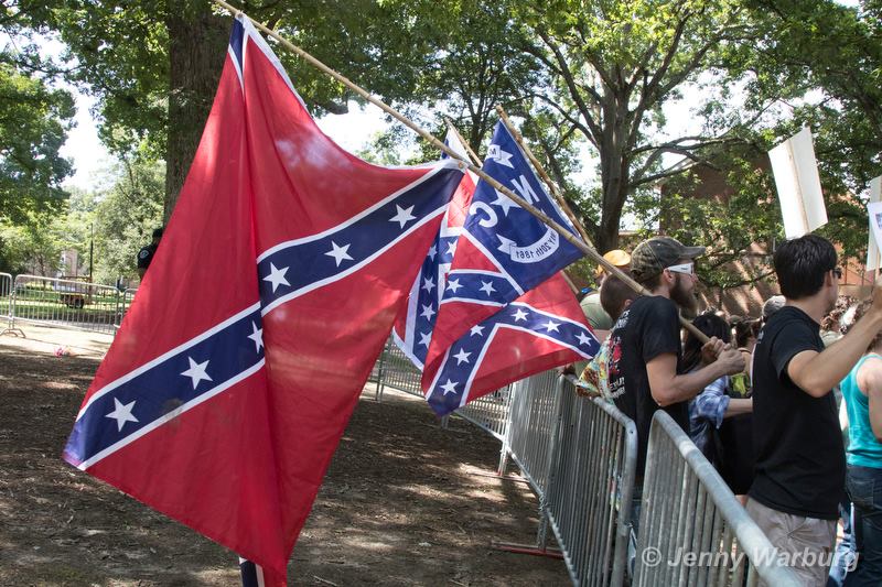 August 25, 2018 -- Pro-Confederacy demonstrators unfurl their flags on the perimeter of the site of the empty pedestal that bore a statue of Confederate soldier on the campus of the University of North Carolina-Chapel Hill. Anti-racism protesters toppled the statute of August 20. (Photo: © Jenny Warburg)