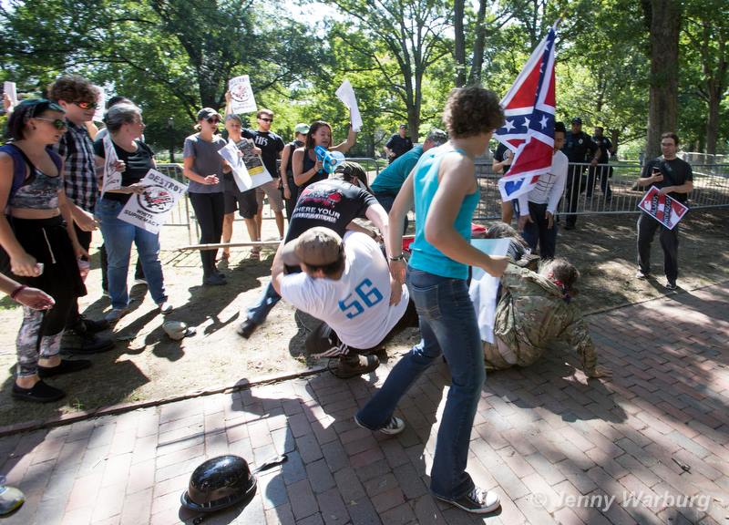 August 25, 2018 -- A scuffle between pro-Confederate and anti-racism demonstrators at the site of the toppled statue of a Confederate soldier at University of North Carolina-Chapel Hill. By day's end, seven people would be arrested. (Photo: © Jenny Warburg)