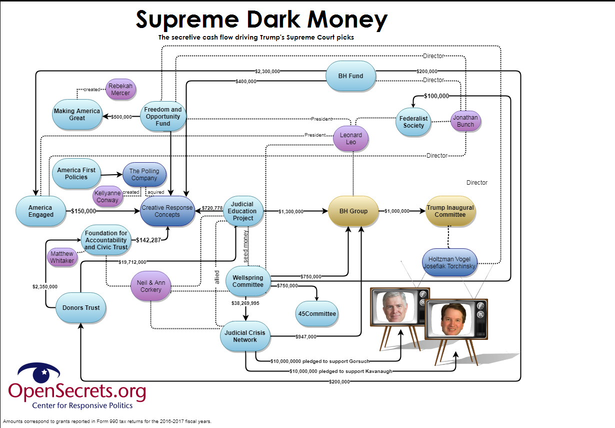 This chart from OpenSecrets.org shows the flow of millions of dollars between right-wing entities to promote the nominations of right-wing judges. To locate the Federalist Society's Leonard Leo, find the purple oval between "BH Group" and "BH Fund".
