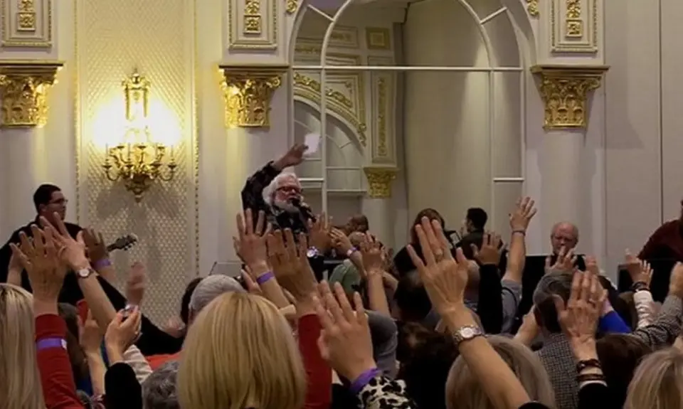 Chuck Pierce, one of the big draws at the February “Turnaround” event, was Thursday night’s keynote speaker. He said that God “orchestrated” the group’s shift to the Trump hotel because it was “important to come back and be here and to keep this portal open under this covering.” According to Pierce, we are entering a period of intense spiritual conflict, not just against demonic strongholds, but “demonic confederacies” that need to be “dethroned” all over the U.S. He said the recent earthquake in Alaska was a sign of the “shaking” that America will experience this year because heaven is “penetrating” the earth.