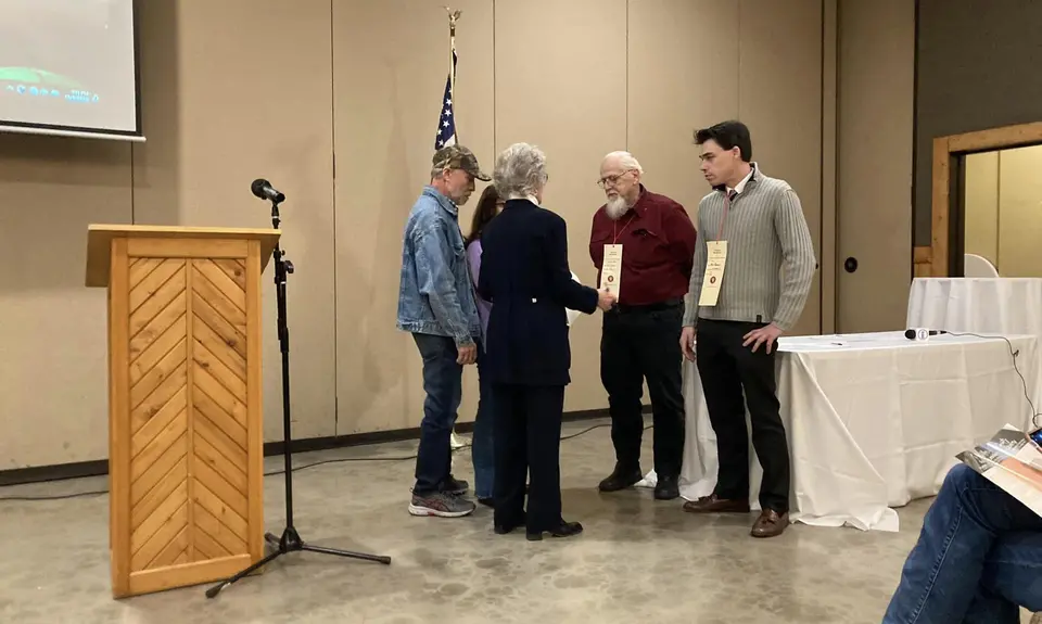 Two men (second from left and far right) pose for a photo at the St. Clair County Convention wearing white nationalist America First gear. (Source: Facebook)