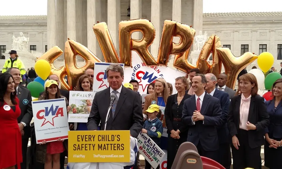 The press conference was staged to highlight the playground issue: adorable kids sat on a plastic slides and old tires and held signs promoting the hashtag #fairplay. But as the speakers made clear, Religious Right leaders are interested in far more than whether one particular playground gets a safer surface. They hope the justices will use the case to overturn so-called “Blaine amendments,” provisions in more than 30 state constitutions that prohibit direct aid to churches or religious schools. Those provisions have often served as an impediment to the powerful political movement that seeks to divert public education funds into religious schools under the banner of “school choice.” Hillary Byrnes, assistant general counsel for the U.S. Conference of Catholic Bishops, said a victory in this case could mean “good things for the school choice movement in our country.”